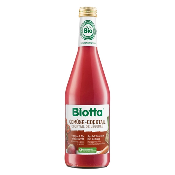 Der Biotta Gemüse-Cocktail ist eine genussvolle Mischung aus verschiedenen Bio-Gemüsen, verfeinert mit einer Prise Meersalz. Er ist vielfältig einsetzbar. So überrascht er als perfekter Apéro-Begleiter oder aber als warme Suppe. Auch zwischendurch ist er die praktische Portion Gemüse.
