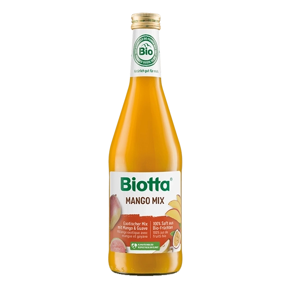 Biotta Mango Mix ist in der traditionellen 500 ml Glasflasche sowie in der praktischen 250 ml Flasche erhältlich. Traubensaft, Mangopüree, Birnensaft, Kiwisaft, Guavepüree, Passionsfruchtsaft. Aus biologischem Anbau. Allergene: Keine deklarationspflichtigen Allergene enthalten.