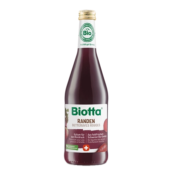 Der erntefrisch gepresste Biotta Bio-Randensaft (Rote Beetesaft) enthält natürliche wertvolle Betacyane (violett-rote Farbe der Randen). Die Betacyane stärken die körpereigene Abwehrkraft und aktivieren die Atmung von geschädigten Zellen.
