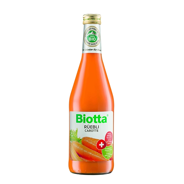 Der Biotta Bio-Rüeblisaft (Karottensaft) ist verfeinert mit Fruchtsäften und Agavenkonzentrat. Reich an natürlichem ß-Carotin (Provitamin A), das im Körper in das für die Augen sehr wichtige Vitamin A umgewandelt wird. Das Vitamin A wirkt sich auch sehr positiv auf die Pigmentbildung der Haut aus.