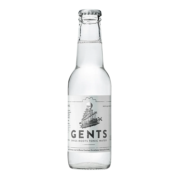 Gents Swiss Roots Tonic Water kombiniert ein nostalgisches Zitronenaroma nach dem Originalrezept von Obermeilen Getränke mit neutral-bitterem Chinin und der herben Lakritz-Note von Enzian aus dem Jura.